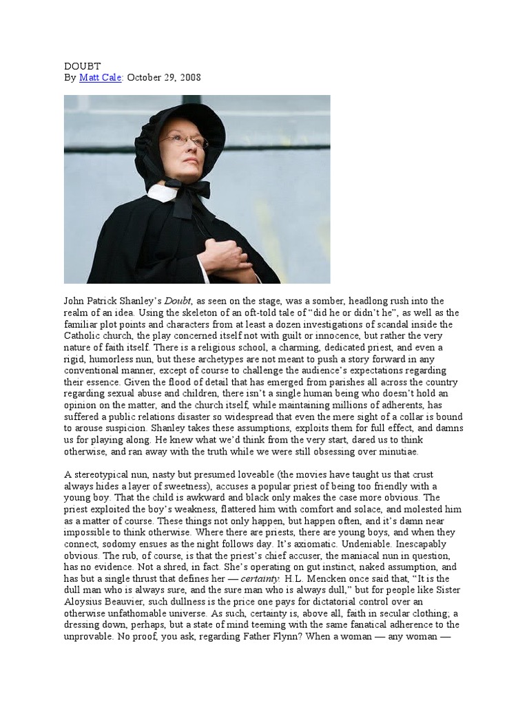 stripped away mystery, discussion, and yes, doubt itself. The play, wisely, never showed any