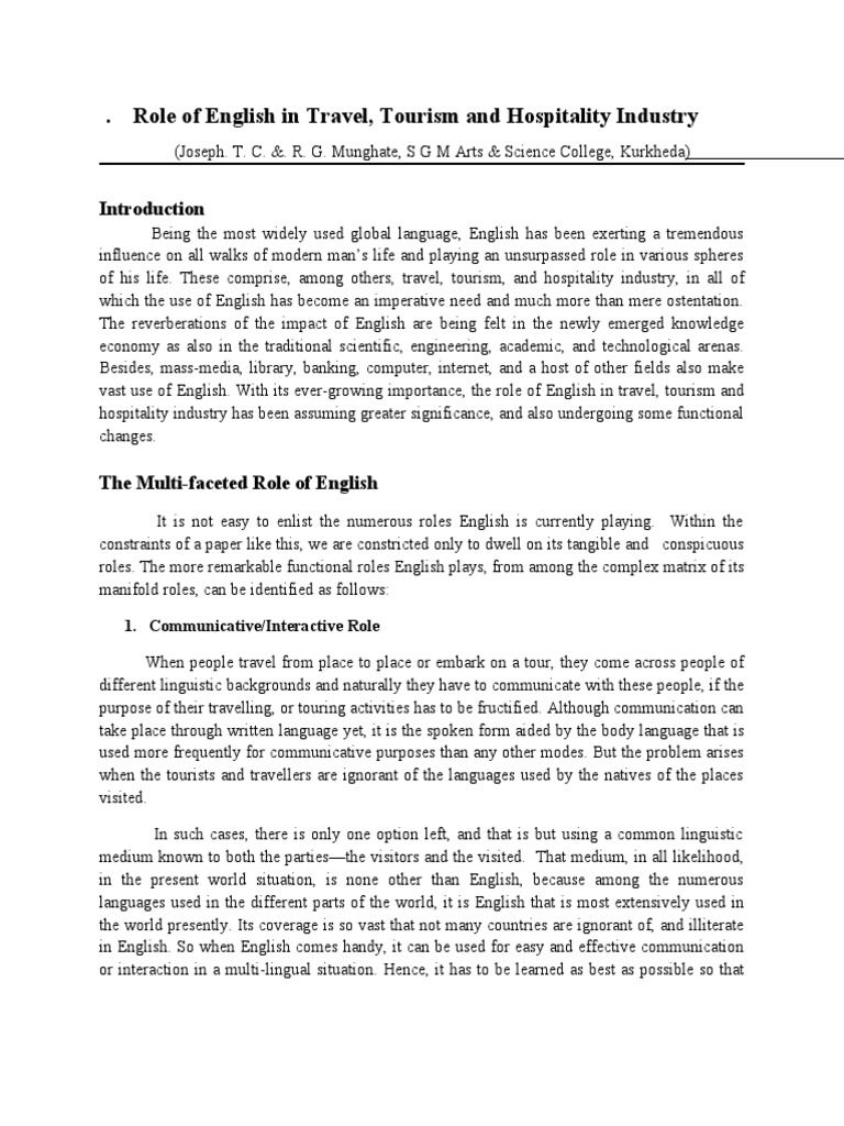 vast use of English. With its ever-growing importance, the role of English in travel, tourism and