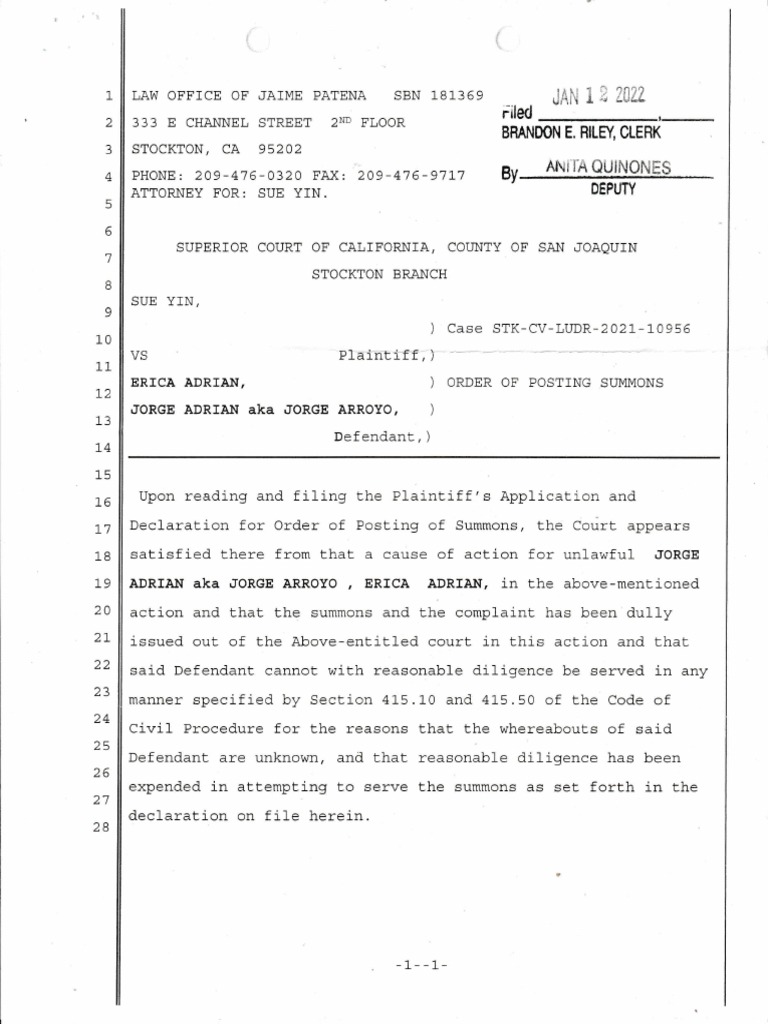 ERICA ADRIAN, ) ONONR OF POSTING SUMMONS