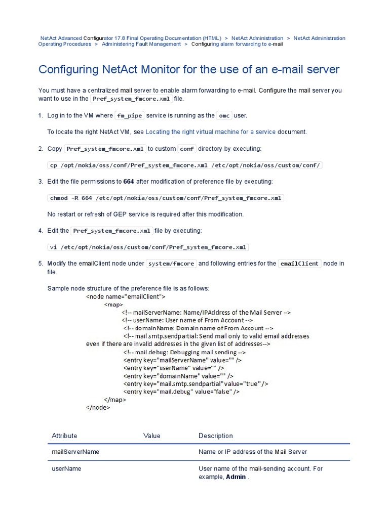 Configuring NetAct Monitor for the use of an e-mail server