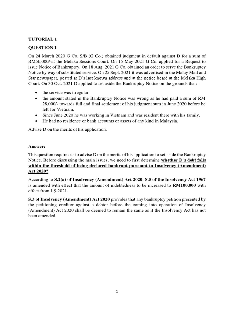 bankrupt pursuant to Insolvency (Amendment) Act 2020 i.e. RM100,000. The minimum