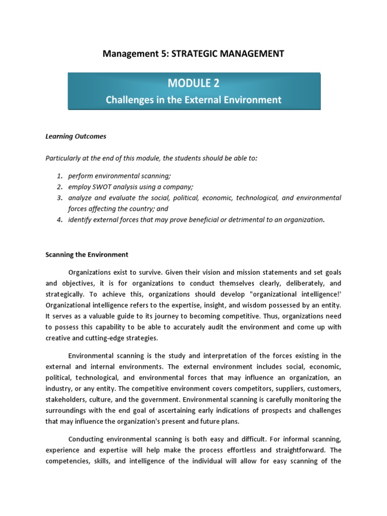 stakeholders, culture, and the government. Environmental scanning is carefully monitoring the
