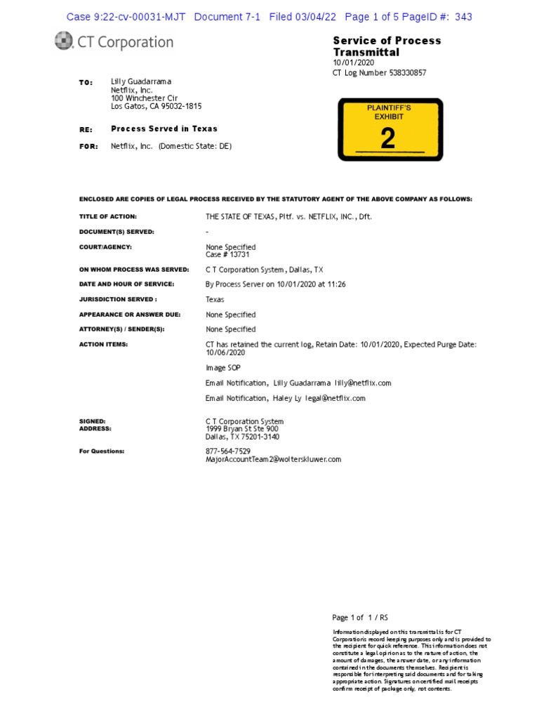 TITLE OF ACTION: THE STATE OF TEXAS, Pltf. vs. NETFLIX, INC., Dft.