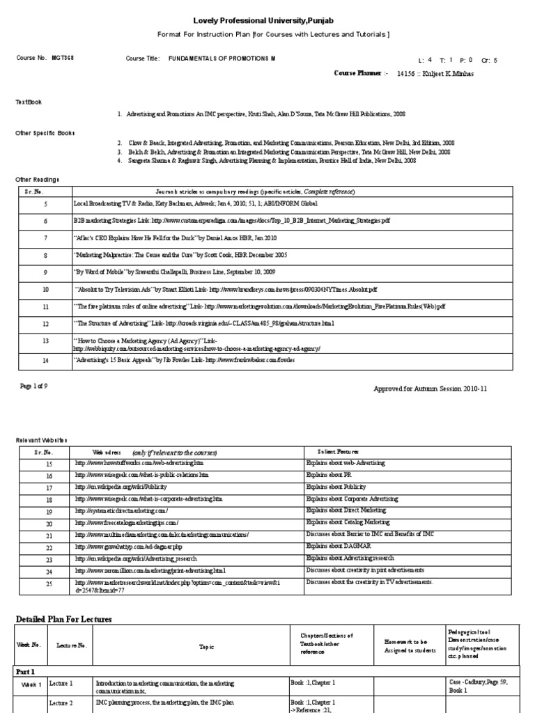 Course No. MGT368 Course Title: FUNDAMENTALS OF PROMOTIONS MANAGEMENT L: 4 T: 1 P: 0 Cr: 5