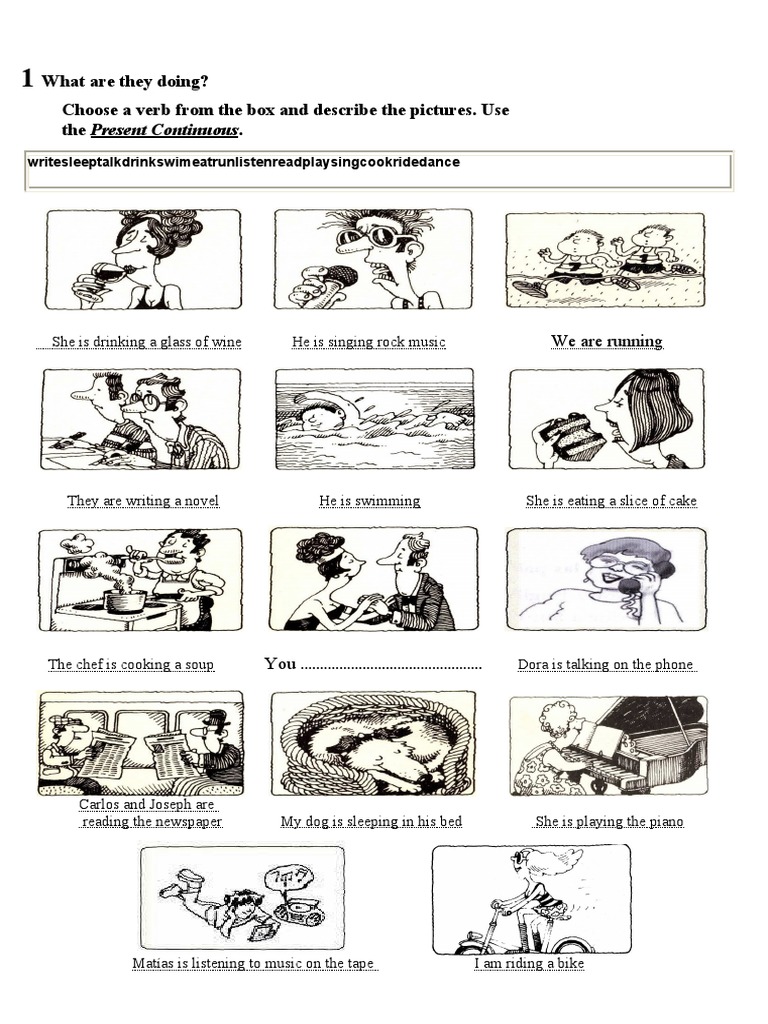 reading the newspaper My dog is sleeping in his bed She is playing the piano