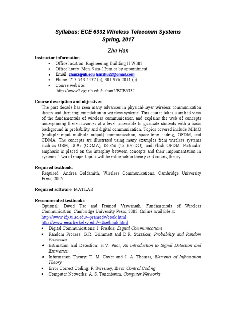 Syllabus: ECE 6332 Wireless Telecomm Systems