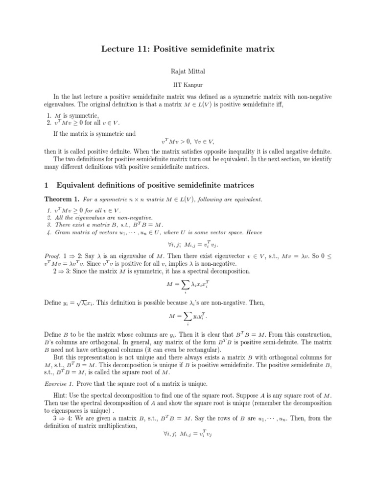 In the last lecture a positive semidefinite matrix was defined as a symmetric matrix with non-negative