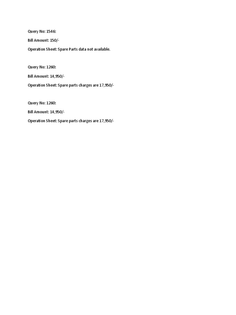 The document contains details of 3 queries with bill amounts and operation sheets noting spare parts data or charges.