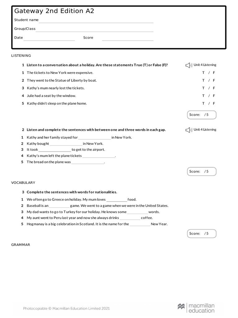 1 Listen to a conversation about a holiday. Are these statements T rue (T ) or False (F)? Unit 4 Listening