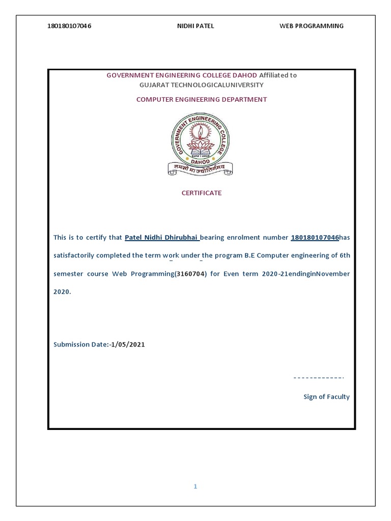 This is to certify that Patel Nidhi Dhirubhai bearing enrolment number 180180107046has