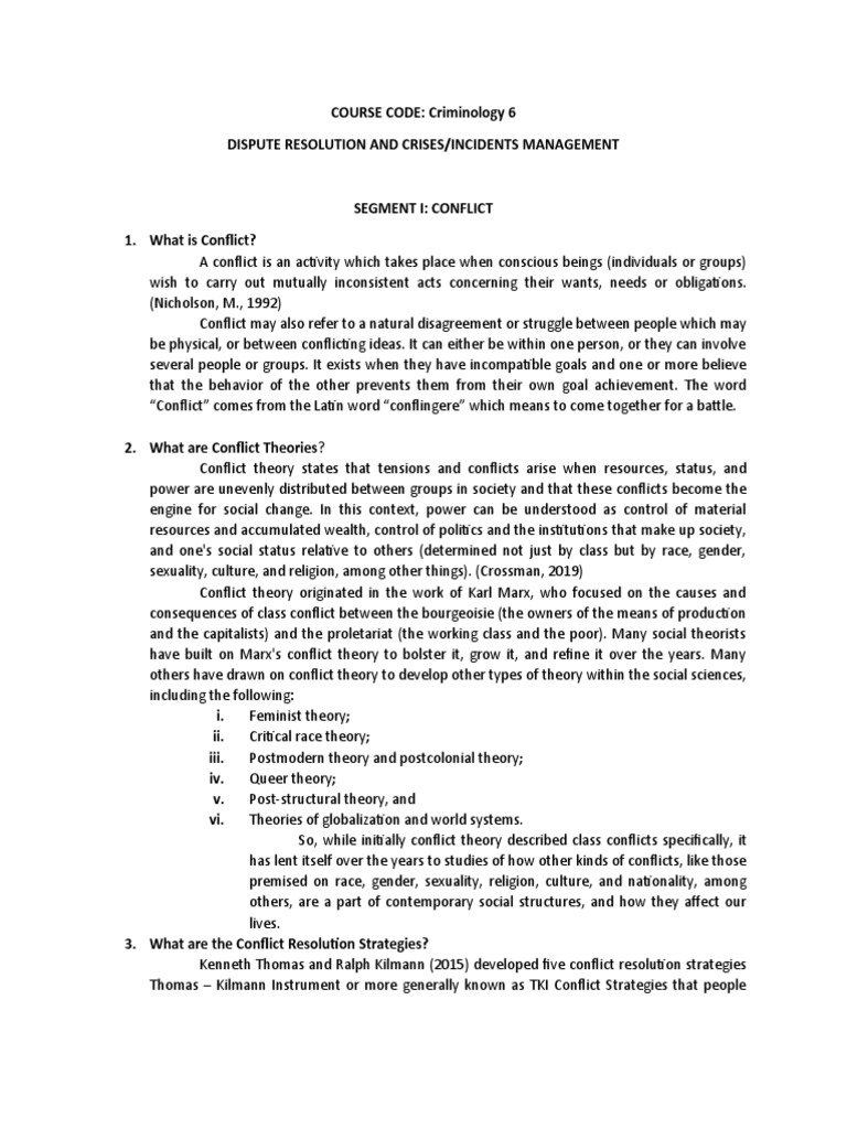 DISPUTE RESOLUTION AND CRISES/INCIDENTS MANAGEMENT