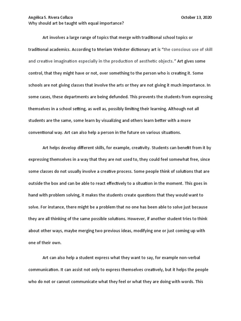 traditional academics. According to Meriam Webster dictionary art is “the conscious use of skill