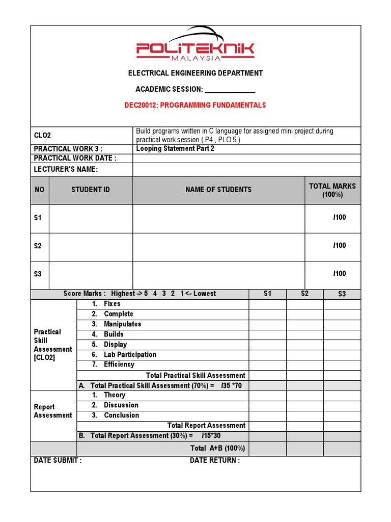 PRACTICAL WORK 3 : Looping Statement Part 2