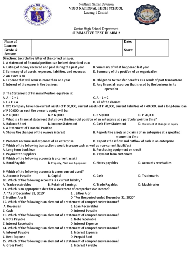 C. Summary of all assets, expenses, liabilities, and revenues D. Summary of the position of an organization