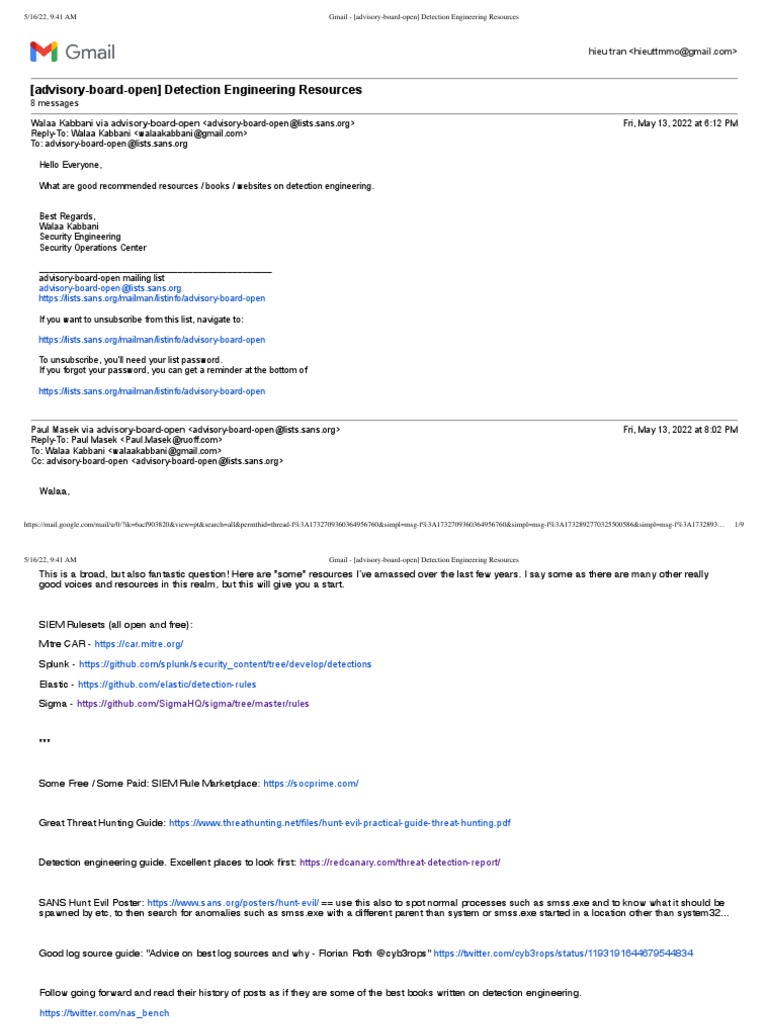 5/16/22, 9:41 AM Gmail - [advisory-board-open] Detection Engineering Resources