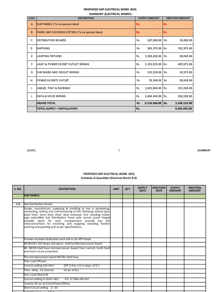 PROPOSED NXP ELECTRICAL WORK BOQ