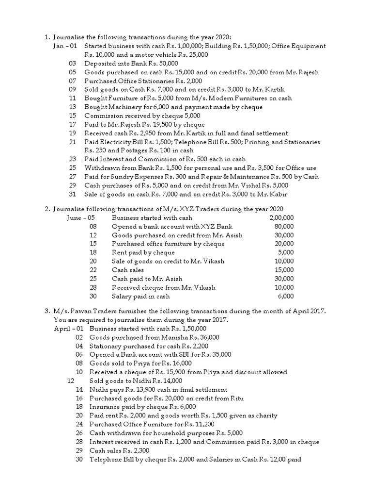 2. Journalise following transactions of M/s. XYZ Traders during the year 2020