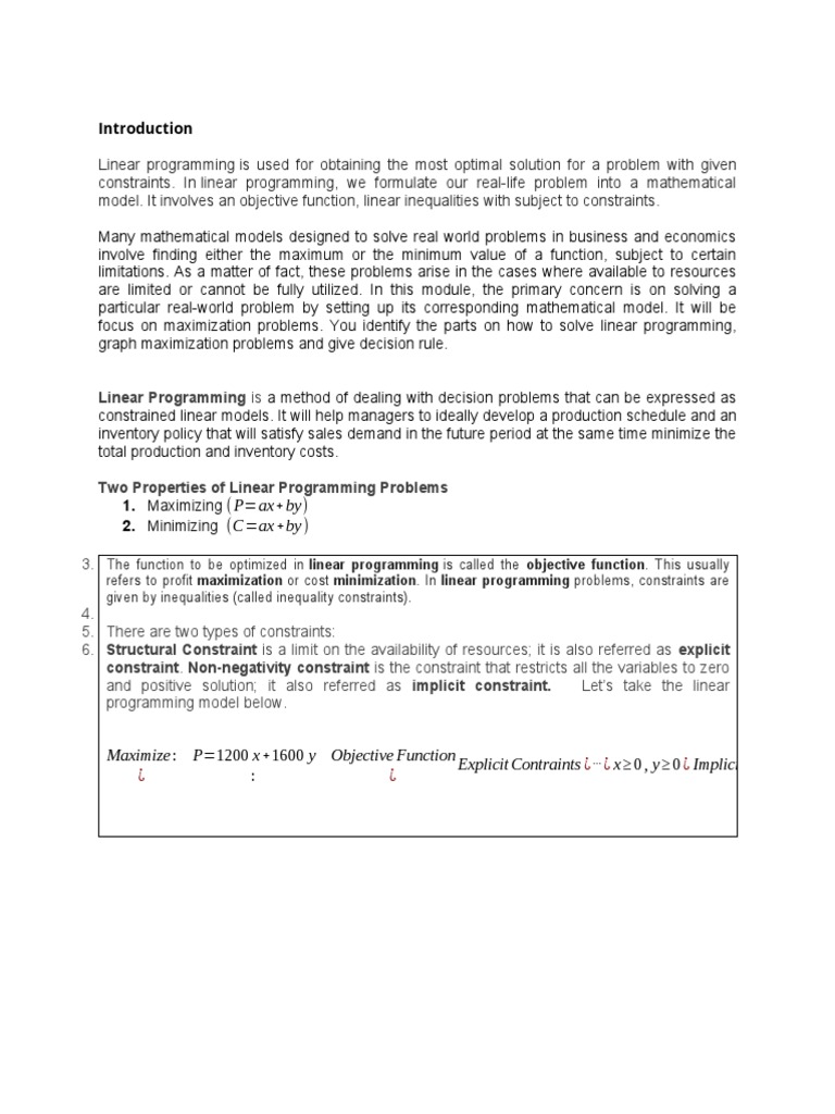 constraints. In linear programming, we formulate our real-life problem into a mathematical