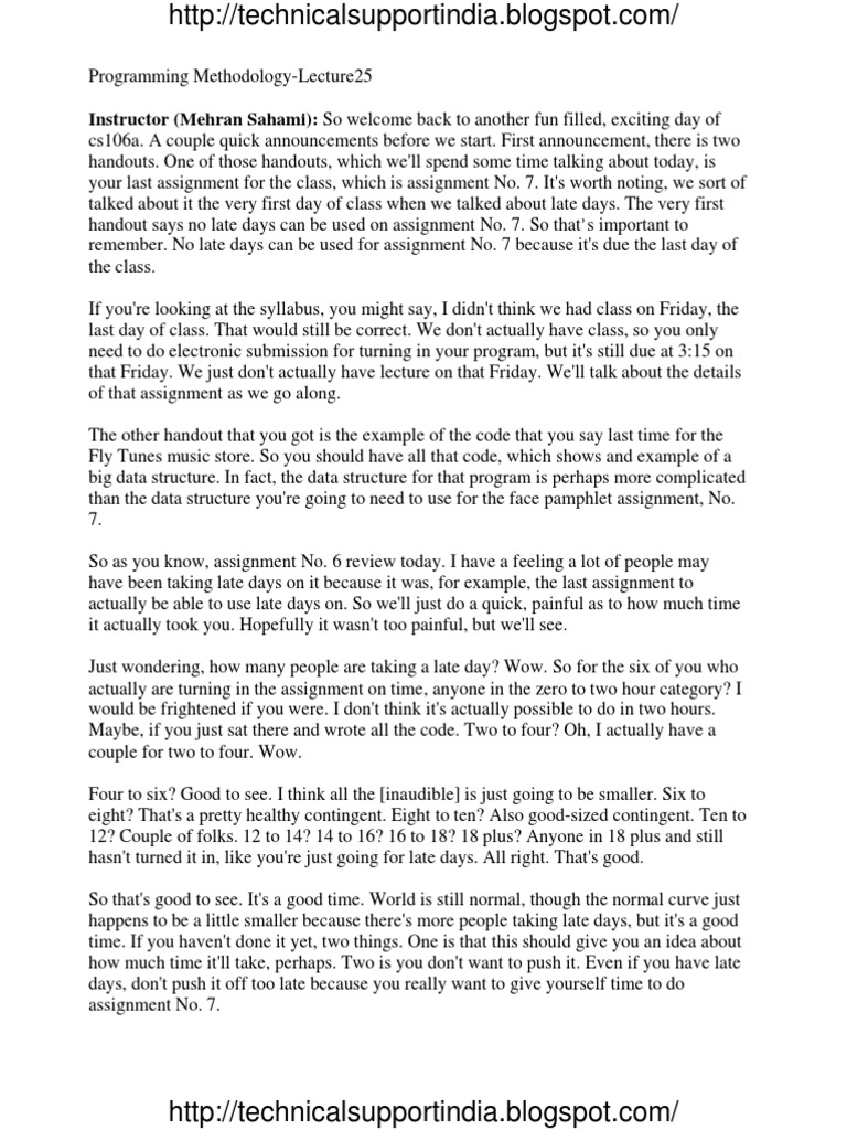Programming Methodology-Lecture25 Instructor (Mehran Sahami): So welcome back to another fun filled, exciting day of cs106a. A couple quick announcements before we start. First announcement, there is two handouts. One of those handouts, which we'll spend some time talking about today, is your last assignment for the class, which is assignment No. 7. It's worth noting, we sort of talked about it the very first day of class when we talked about late days. The very first handout says no late days can be used on assignment No. 7. So thats important to remember. No late days can be used for assignment No. 7 because it's due the last day of the class. If you're looking at the syllabus, you might say, I didn't think we had class on Friday, the last day of class. That would still be correct. We don't actually have class, so you only need to do electronic submission for turning in your program, but it's still due at 3:15 on that Friday. We just don't actually have lecture on that Friday. We'll talk about the details of that assignment as we go along. The other handout that you got is the example of the code that you say last time for the Fly Tunes music store. So you should have all that code, which shows and example of a big data structure. In fact, the data structure for that program is perhaps more complicated than the data structure you're going to need to use for the face pamphlet assignment, No. 7. So as you know, assignment No. 6 review today. I have a feeling a lot of people may have been taking late days on it because it was, for example, the last assignment to actually be able to use late days on. So we'll just do a quick, painful as to how much time it actually took you. Hopefully it wasn't too painful, but we'll see. Just wondering, how many people are taking a late day? Wow. So for the six of you who actually are turning in the assignment on time, anyone in the zero to two hour category? I would be frightened if you were. I don't think it's actually possible to do in two hours. Maybe, if you just sat there and wrote all the code. Two to four? Oh, I actually have a couple for two to four. Wow. Four to six? Good to see. I think all the [inaudible] is just going to be smaller. Six to eight? That's a pretty healthy contingent. Eight to ten? Also good-sized contingent. Ten to 12? Couple of folks. 12 to 14? 14 to 16? 16 to 18? 18 plus? Anyone in 18 plus and still hasn't turned it in, like you're just going for late days. All right. That's good. So that's good to see. It's a good time. World is still normal, though the normal curve just happens to be a little smaller because there's more people taking late days, but it's a good time. If you haven't done it yet, two things. One is that this should give you an idea about how much time it'll take, perhaps. Two is you don't want to push it. Even if you have late days, don't push it off too late because you really want to give yourself time to do assignment No. 7.