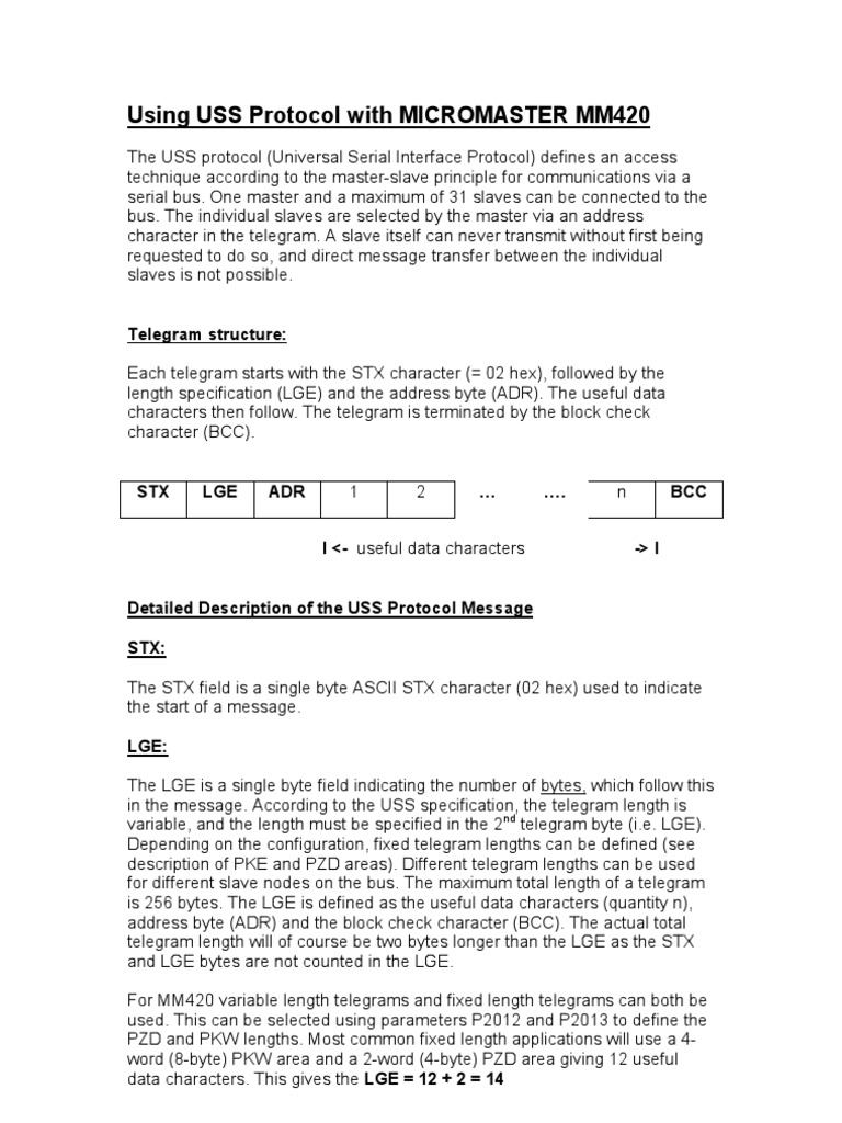 The STX field is a single byte ASCII STX character (02 hex) used to indicate the start of a message. LGE: The LGE is a single byte field indicating the number of bytes, which follow this in the message. According to the USS specification, the telegram length is variable, and the length must be specified in the 2nd telegram byte (i.e. LGE). Depending on the configuration, fixed telegram lengths can be defined (see description of PKE and PZD areas). Different telegram lengths can be used for different slave nodes on the bus. The maximum total length of a telegram is 256 bytes. The LGE is defined as the useful data characters (quantity n), address byte (ADR) and the block check character (BCC). The actual total telegram length will of course be two bytes longer than the LGE as the STX and LGE bytes are not counted in the LGE. For MM420 variable length telegrams and fixed length telegrams can both be used. This can be selected using parameters P2012 and P2013 to define the PZD and PKW lengths. Most common fixed length applications will use a 4word (8-byte) PKW area and a 2-word (4-byte) PZD area giving 12 useful data characters. This gives the LGE = 12 + 2 = 14