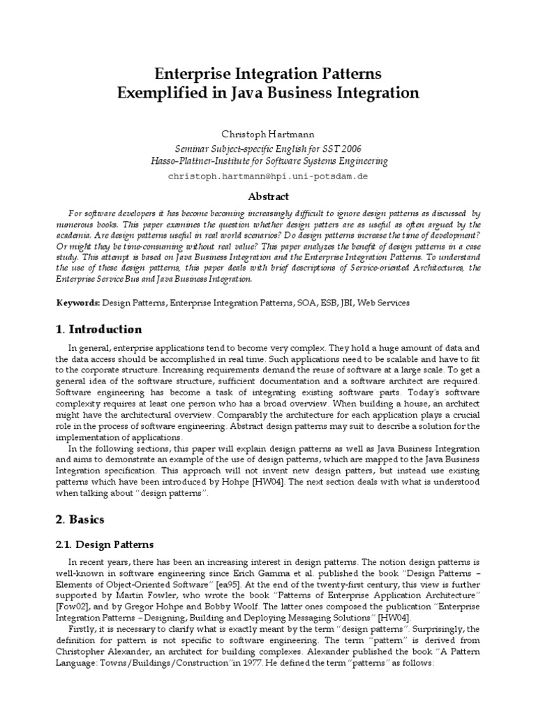 In recent years, there has been an increasing interest in design patterns. The notion design patterns is well-known in software engineering since Erich Gamma et al. published the book Design Patterns Elements of Object-Oriented Software [ea95]. At the end of the twenty-first century, this view is further supported by Martin Fowler, who wrote the book Patterns of Enterprise Application Architecture [Fow02], and by Gregor Hohpe and Bobby Woolf. The latter ones composed the publication Enterprise Integration Patterns Designing, Building and Deploying Messaging Solutions [HW04]. Firstly, it is necessary to clarify what is exactly meant by the term design patterns. Surprisingly, the definition for pattern is not specific to software engineering. The term pattern is derived from Christopher Alexander, an architect for building complexes. Alexander published the book A Pattern Language: Towns/Buildings/Constructionin 1977. He defined the term patterns as follows: