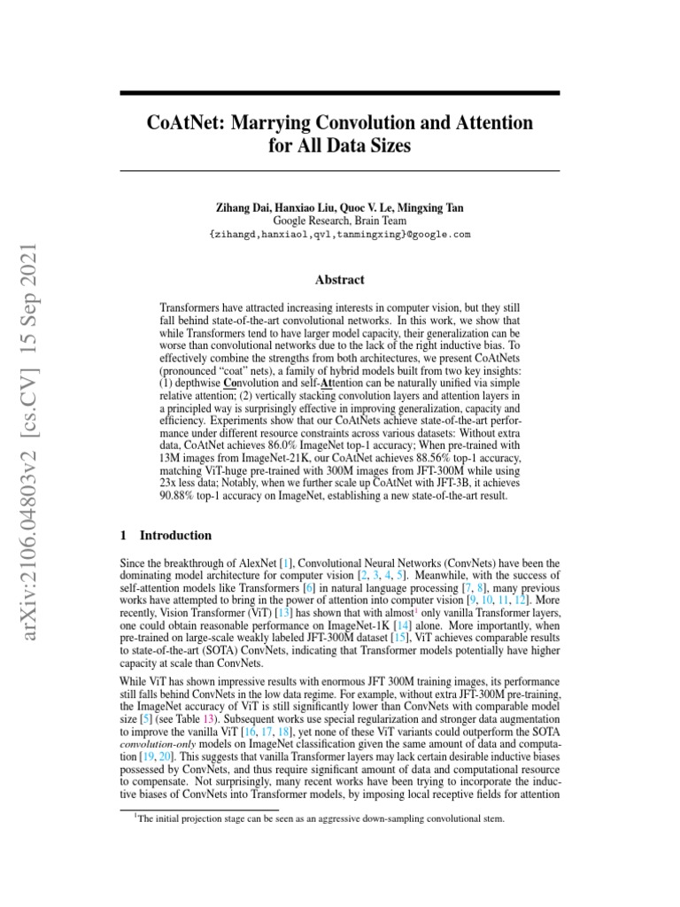 of ConvNets thanks to the favorable inductive biases. Moreover, given abundant data, CoAtNet not