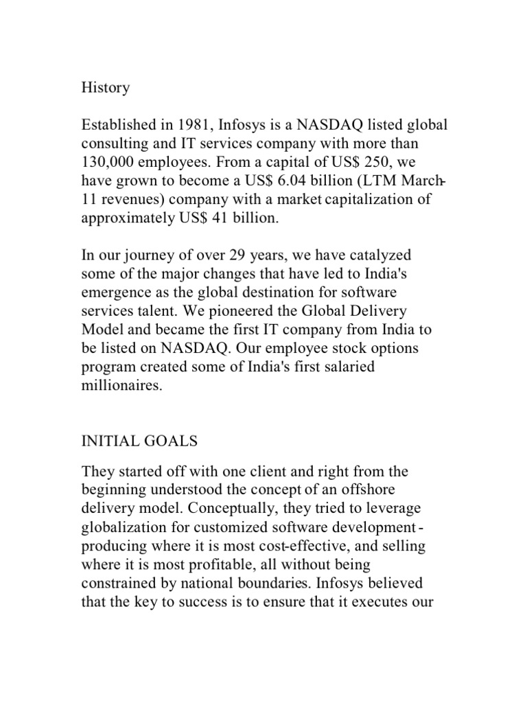 INITIAL GOALS They started off with one client and right from the beginning understood the concept of an offshore delivery model. Conceptually, they tried to leverage globalization for customized software development producing where it is most cost-effective, and selling where it is most profitable, all without being constrained by national boundaries. Infosys believed that the key to success is to ensure that it executes our