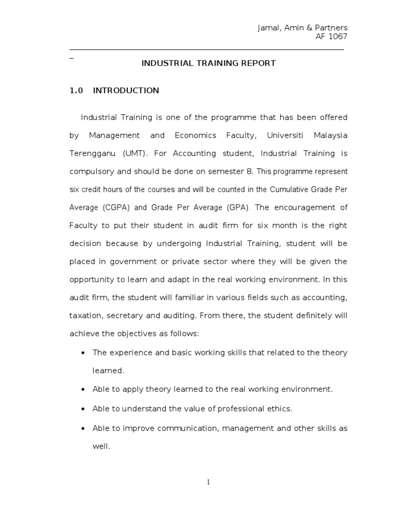 Terengganu (UMT). For Accounting student, Industrial Training is compulsory and should be done on semester 8. This programme represent six credit hours of the courses and will be counted in the Cumulative Grade Per Average (CGPA) and Grade Per Average (GPA). The encouragement of Faculty to put their student in audit firm for six month is the right decision because by undergoing Industrial Training, student will be placed in government or private sector where they will be given the opportunity to learn and adapt in the real working environment. In this audit firm, the student will familiar in various fields such as accounting, taxation, secretary and auditing. From there, the student definitely will achieve the objectives as follows: The experience and basic working skills that related to the theory learned. Able to apply theory learned to the real working environment. Able to understand the value of professional ethics. Able to improve communication, management and other skills as well.