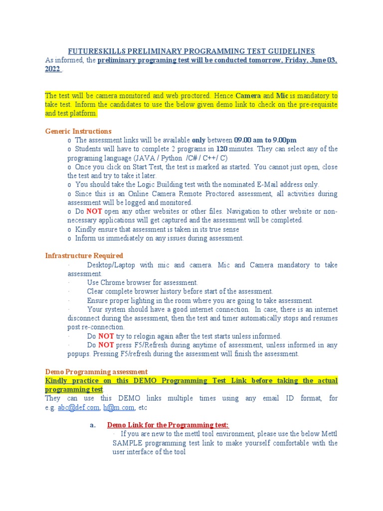 FUTURESKILLS PRELIMINARY PROGRAMMING TEST GUIDELINES