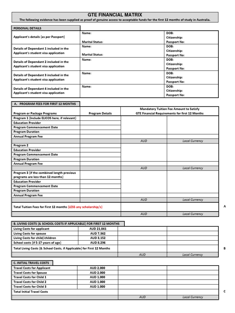 The following evidence has been supplied as proof of genuine access to acceptable funds for the first 12 months of study in Australia.