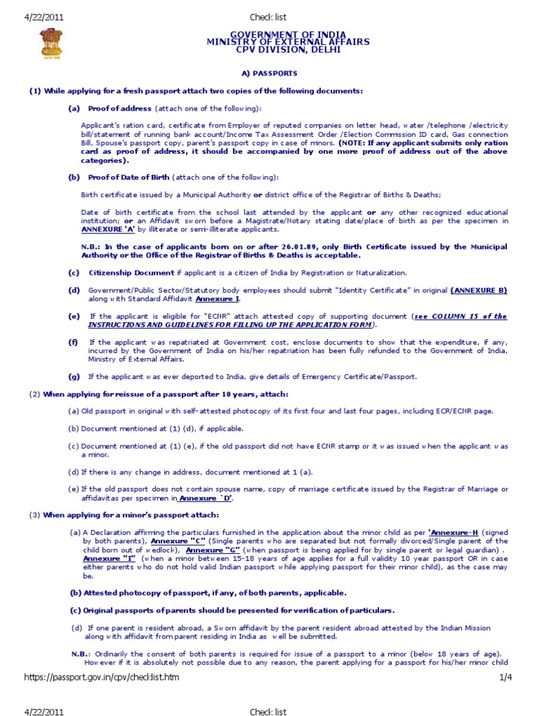 A) PASSPORTS (1) While applying for a fresh passport attach two copies of the following documents: (a) Proof of address (attach one of the following): Applicants ration card, certificate from Employer of reputed companies on letter head, water /telephone /electricity bill/statement of running bank ac count/Inc ome Tax Assessment Order /Elec tion Commission ID card, Gas connection Bill, Spouses passport copy, parents passport copy in case of minors. (NOTE: If any applicant submits only ration card as proof of address, it should be accompanied by one more proof of address out of the above categories). (b) Proof of Date of Birth (attach one of the following): Birth certificate issued by a Municipal Authority or district office of the Registrar of Births & Deaths; Date of birth certificate from the school last attended by the applicant or any other recognized educational institution; or an Affidavit sworn before a Magistrate/Notary stating date/place of birth as per the specimen in ANNEXURE A by illiterate or semi-illiterate applicants. N.B.: In the case of applicants born on or after 26.01.89, only Birth Certificate issued by the Municipal Authority or the Office of the Registrar of Births & Deaths is acceptable. (c) (d) Citizenship Document if applicant is a citizen of India by Registration or Naturalization. Government/Public Sector/Statutory body employees should submit Identity Certificate in original (ANNEXURE B) along with Standard Affidavit Annexure I. If the applicant is eligible for ECNR attach attested copy of supporting document (see COLUMN 15 of the INSTRUCTIONS AND GUIDELINES FOR FILLING UP THE APPLICATION FORM). If the applicant was repatriated at Government cost, enclose documents to show that the expenditure, if any, incurred by the Government of India on his/her repatriation has been fully refunded to the Government of India, Ministry of External Affairs. If the applicant was ever deported to India, give details of Emergency Certificate/Passport.