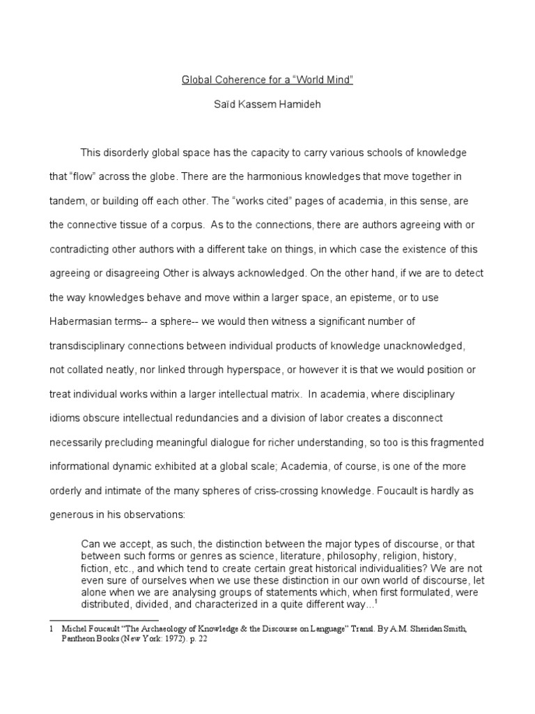 This disorderly global space has the capacity to carry various schools of knowledge that flow across the globe. There are the harmonious knowledges that move together in tandem, or building off each other. The works cited pages of academia, in this sense, are the connective tissue of a corpus. As to the connections, there are authors agreeing with or contradicting other authors with a different take on things, in which case the existence of this agreeing or disagreeing Other is always acknowledged. On the other hand, if we are to detect the way knowledges behave and move within a larger space, an episteme, or to use Habermasian terms-- a sphere-- we would then witness a significant number of transdisciplinary connections between individual products of knowledge unacknowledged, not collated neatly, nor linked through hyperspace, or however it is that we would position or treat individual works within a larger intellectual matrix. In academia, where disciplinary idioms obscure intellectual redundancies and a division of labor creates a disconnect necessarily precluding meaningful dialogue for richer understanding, so too is this fragmented informational dynamic exhibited at a global scale; Academia, of course, is one of the more orderly and intimate of the many spheres of criss-crossing knowledge. Foucault is hardly as generous in his observations: Can we accept, as such, the distinction between the major types of discourse, or that between such forms or genres as science, literature, philosophy, religion, history, fiction, etc., and which tend to create certain great historical individualities? We are not even sure of ourselves when we use these distinction in our own world of discourse, let alone when we are analysing groups of statements which, when first formulated, were distributed, divided, and characterized in a quite different way...1