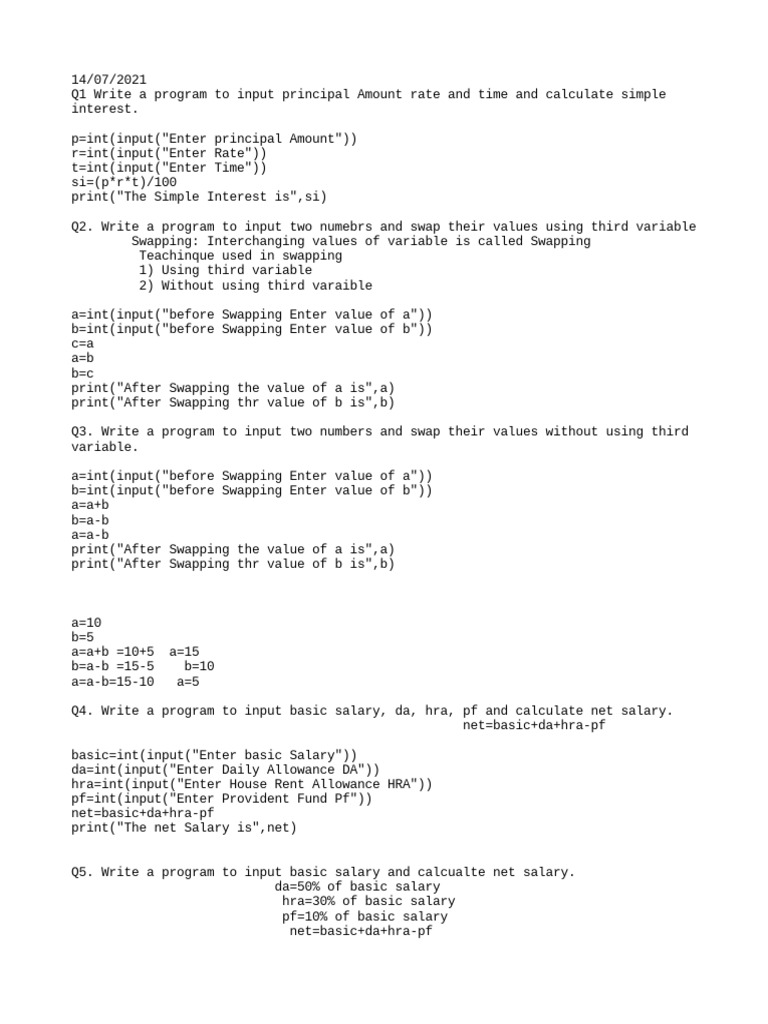 Q1 Write a program to input principal Amount rate and time and calculate simple