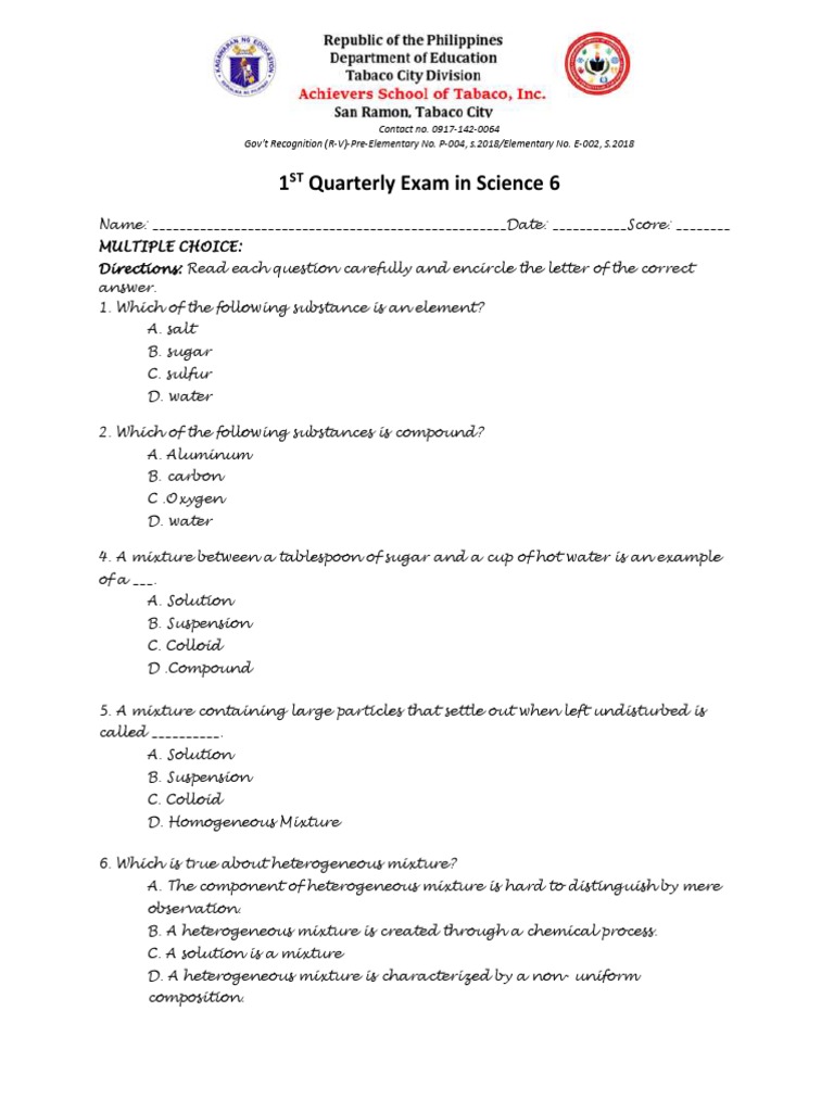 1ST Quarterly Exam in Science 6