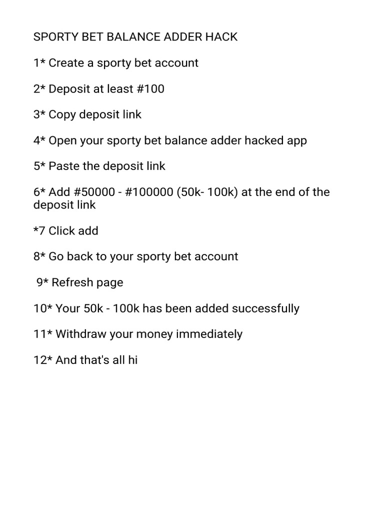 The document provides instructions for hacking a sporty bet account to add a large balance. It involves creating an account, depositing funds, copying the deposit link, modifying the link amount using a hacked app, refreshing the account to see the added funds, and immediately withdrawing the money.