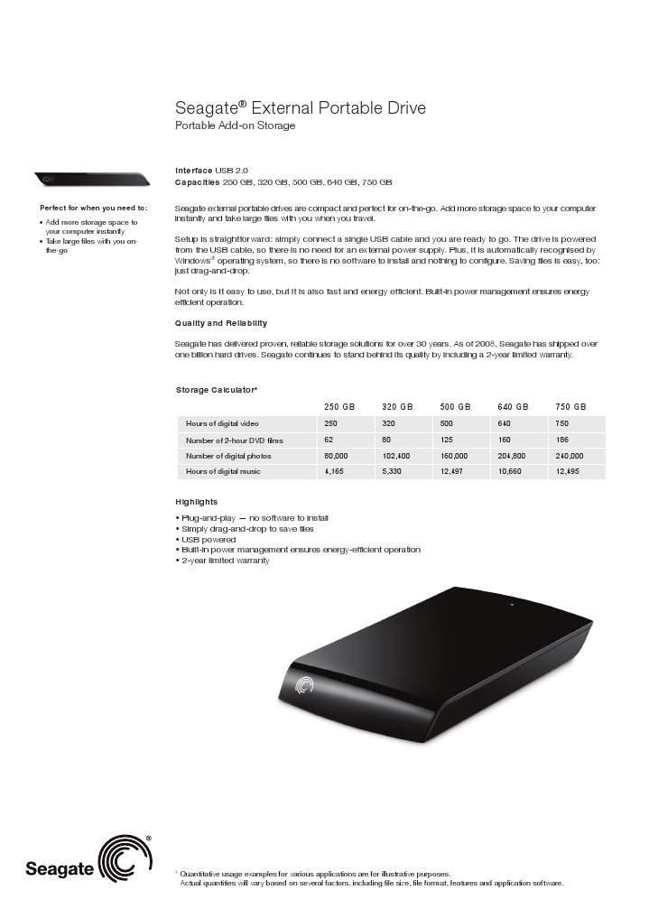 2009 Seagate Technology LLC. All rights reserved. Seagate, Seagate Technology, and the Wave logo are trademarks or registered trademarks of Seagate Technology LLC or one of its affiliated companies in the United States and/or other countries. All other trademarks or registered trademarks are the property of their respective owners. When referring to hard drive capacity, one gigabyte, or GB, equals one billion bytes and one terabyte, or TB, equals one trillion bytes. Your computer operating system may use a different standard of measurement and report a lower capacity. In addition, some of the listed capacity is used for formatting and other functions, and thus will not be available for data storage. Quantitative usage examples for various applications are for illustrative purposes. Actual quantities will vary based on several factors, including file size, file format, features and application software. Seagate reserves the right to change, without notice, product offerings or specifications. Seagate Technology LLC, 920 Disc Drive, Scotts Valley CA 95066 USA www.seagate.com DS1674.3-0911GB