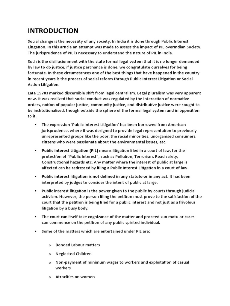 Litigation. In this article an attempt was made to assess the impact of PIL overIndian Society.