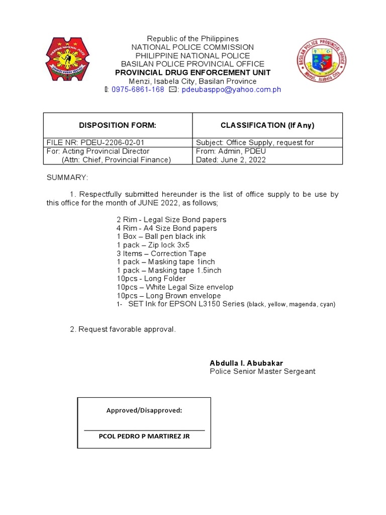 1. Respectfully submitted hereunder is the Disposition Form requesting office supply,