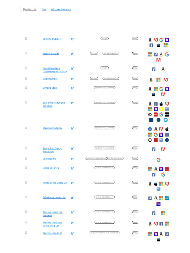 Question List Tips Acknowledgements
