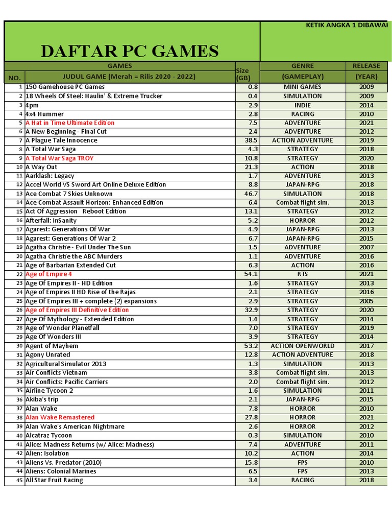 NO. JUDUL GAME (Merah = Rilis 2020 - 2022) (GB) (GAMEPLAY) (YEAR)