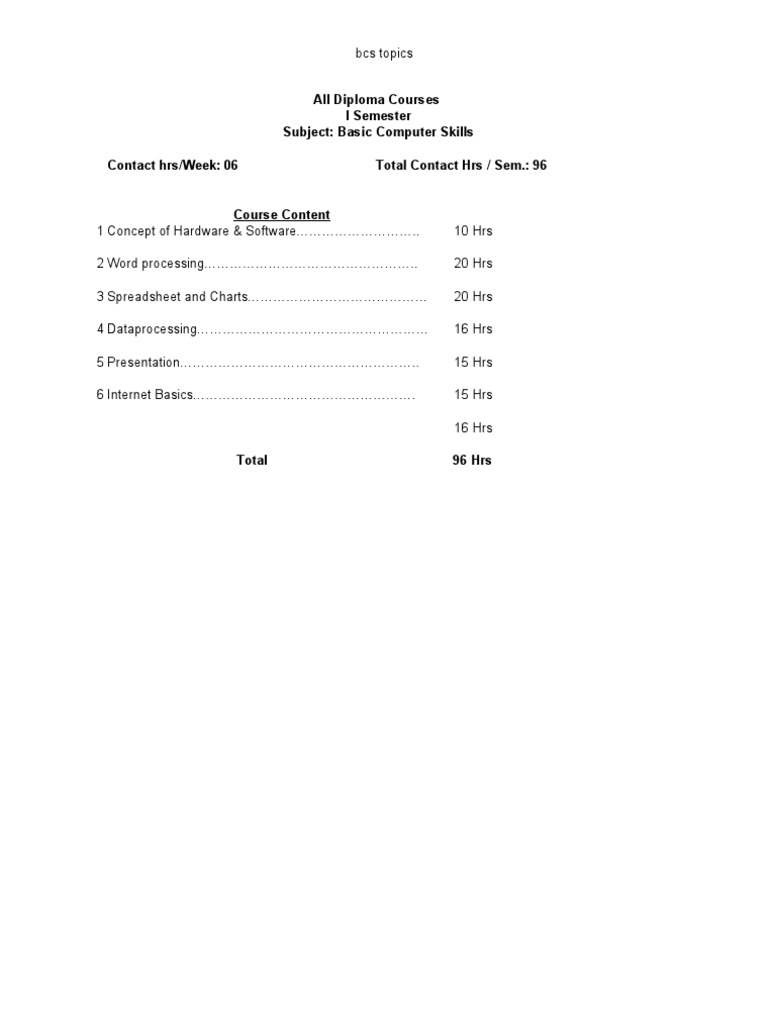 bcs topics All Diploma Courses I Semester Subject: Basic Computer Skills Contact hrs/Week: 06 Total Contact Hrs