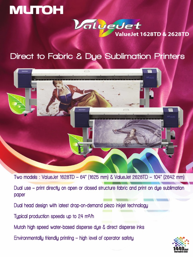 • Use of Mutoh’s original water-based direct disperse or high speed water-based disperse dye inks.