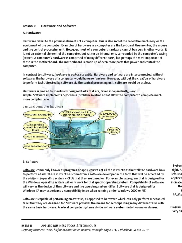 equipment of the computer. Examples of hardware in a computer are the keyboard, the monitor, the mouse