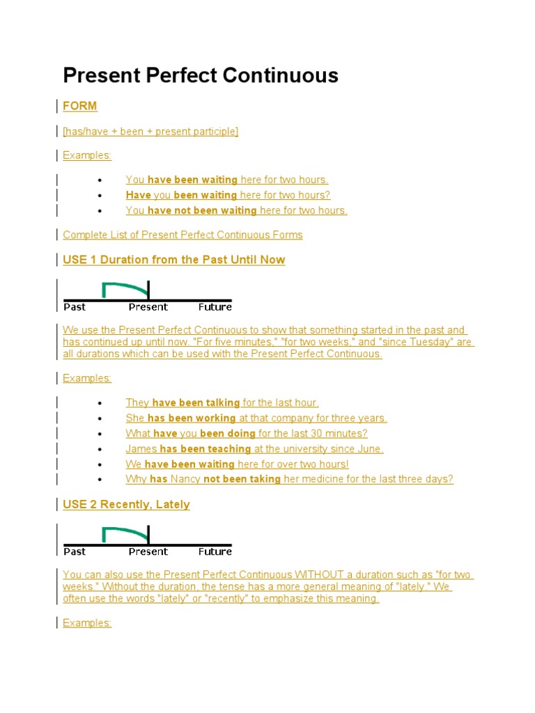 They have been talking for the last hour. She has been working at that company for three years. What have you been doing for the last 30 minutes? James has been teaching at the university since June. We have been waiting here for over two hours! Why has Nancy not been taking her medicine for the last three days?