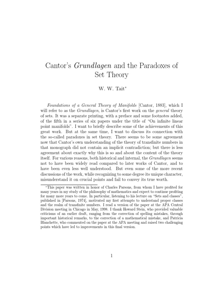 Foundations of a General Theory of Manifolds [Cantor, 1883], which I will refer to as the Grundlagen, is Cantors rst work on the general theory of sets. It was a separate printing, with a preface and some footnotes added, of the fth in a series of six papers under the title of On innite linear point manifolds. I want to briey describe some of the achievements of this great work. But at the same time, I want to discuss its connection with the so-called paradoxes in set theory. There seems to be some agreement now that Cantors own understanding of the theory of transnite numbers in that monograph did not contain an implicit contradiction; but there is less agreement about exactly why this is so and about the content of the theory itself. For various reasons, both historical and internal, the Grundlagen seems not to have been widely read compared to later works of Cantor, and to have been even less well understood. But even some of the more recent discussions of the work, while recognizing to some degree its unique character, misunderstand it on crucial points and fail to convey its true worth.