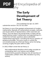 Cantors earlier work in set theory contained 1. A proof that the set of real numbers is not denumerable, i.e. is not in one-to-one correspondance with or, as we shall say, is not equipollent to the set of natural numbers. [1874] 2. A denition of what it means for two sets M and N to have the same power or cardinal number ; namely that they be equipollent.[1878] 3. A proof that the set of real numbers and the set of points in ndimensional Euclidean space have the same power. [1878] So, on the basis of this earlier work, one could conclude that there are at least two innite cardinal numbers, that of the set of natural numbers and that of the set of real numbers, but could not prove that there are more than two innite powers. (It was in [1878] that Cantor stated his Continuum Hypothesis, from which followed that in mathematics prior to 1883 there were precisely two innite powers.) Cantors clarication of the notion of set prior to 1883 should also be mentioned, especially in connection with his denition of cardinal number. Bolzano, in his Paradoxes of the Innite [1851], seems to have already clearly distinguished a set simpliciter from the set armed with some structure: in 4 he writes An aggregate so conceived that it is indierent to the arrangement of its members I call a set. But when he came to discuss cardinal numbers he seems to have forgotten his denition of set and failed to distinguish between, say, the cardinal number of the set of points on the line and the magnitude of the line as a geometric object. For this reason, he was prevented from resolving one of the traditional paradoxes of the innite; namely that, e.g., the interval (0, 1) of real numbers is equipollent to the larger interval (0, 2). Of course, even without the confusion of the set with the geometric object, there is still a conict with Euclids Common Notion 5, that the whole is greater than the part. But this principle does indeed apply to geometric magnitude, and it is likely that, without the confusion, it would have sooner been accepted that innite sets are simply a counterexample to it. In fact, Bolzanos understanding of the notion of set was in general less than perfect. For example, the word I translated as members in the above quote is actually the word Teile for parts, which he generally used to refer to the elements of a set. Throughout his discussion there are signs that he 2