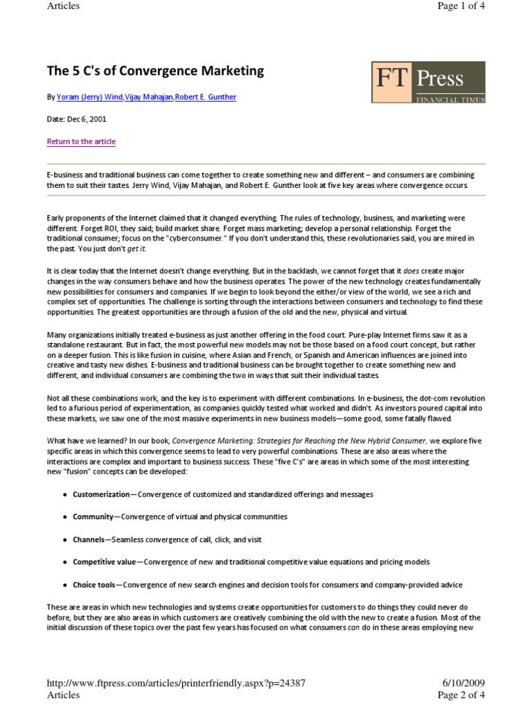 ThesefiveC'sofconvergenceandtheirinteractionsofferrichopportunitiestocreatenewofferingsfromtheconvergenceof newtechnologyandold,andtheyopenupcreativecombinationsofnewandexistingconsumerneedsandbehaviors.Drawing togetherthesedisparateelementsisanartandrequiresextensiveexperimentation,buttheresultscanbefarmorewonderful andrewardingbothforchefs(companies)andtheircustomersthantheindependentcomponentsalone. ThisisthesecondofthreearticlesexploringinsightsfromourbookConvergenceMarketing:StrategiesforReachingtheNew HybridConsumer.Inthefinalarticle,wewillexamineinsightsonredesigningorganizationalarchitecturetocreatea"digital fabric."Apreviousarticleexploredthecomplexinteractionbetweentechnologyandpeople.