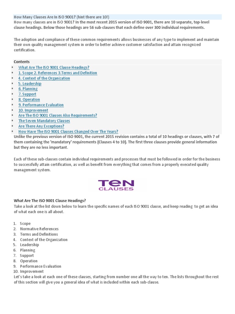 How many clauses are in ISO 9001? In the most recent 2015 version of ISO 9001, there are 10 separate, top-level