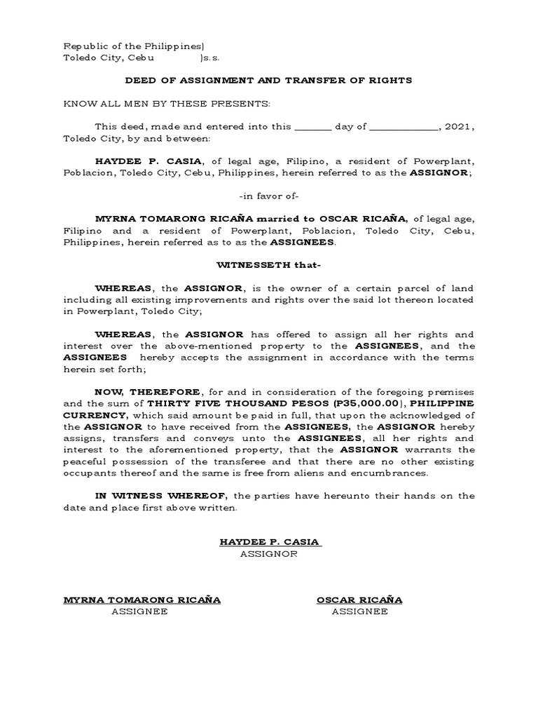 Poblacion, Toledo City, Cebu, Philippines, herein referred to as the ASSIGNOR;