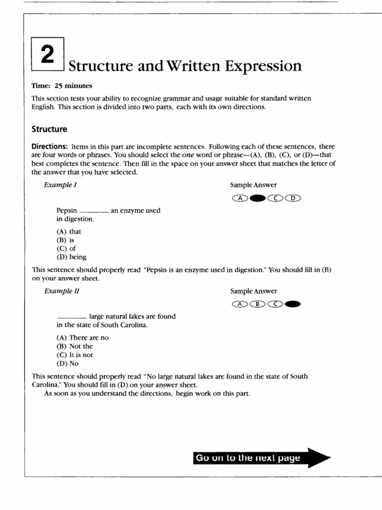Directions: items in this part are incomplete sentences. Following each of these sentences, there